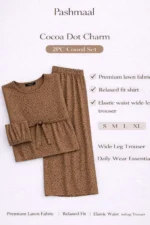 Cocoa brown dot print 2PC coord set by Pashmaal. Premium lawn fabric, relaxed fit shirt with tie waist and wide leg trouser. Perfect for casual everyday wear. Available in S, M, L. COD available across Pakistan.