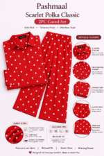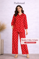 Make a bold statement with the Scarlet Polka Dot 2PC Coord Set by Pashmaal. This striking red and white polka dot coord set is crafted from premium soft lawn fabric — lightweight, breathable, and smooth on skin. The relaxed-fit shirt features a classic collar, front button placket, and straight cuffs for a smart yet effortless look. Paired with a matching wide-leg trouser with elastic waist for all-day comfort.