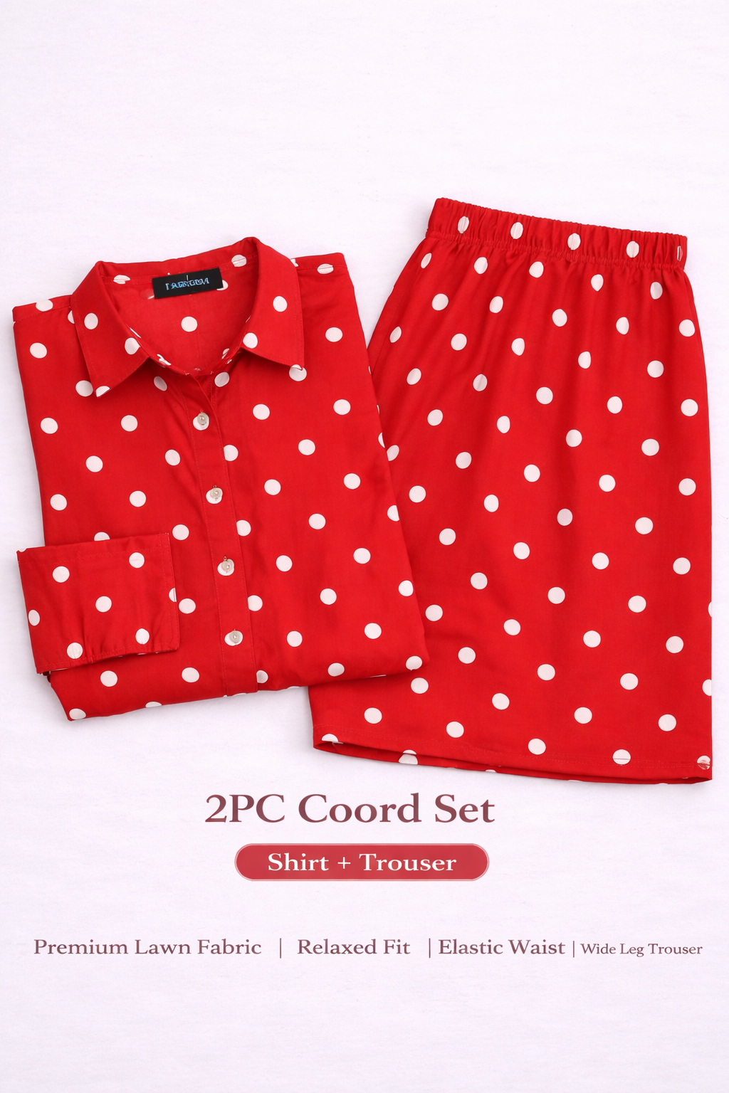 Bold red polka dot 2PC coord set by Pashmaal. Premium lawn fabric, relaxed fit button-down collar shirt with straight cuffs and wide leg trouser. Timeless style for everyday wear. Available in S, M, L, XL. COD available across Pakistan.