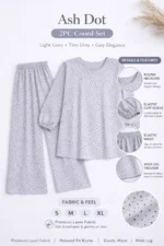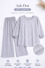 Understated, elegant, and effortlessly wearable — the Ash Dot 2PC Coord Set by Pashmaal is your go-to for everyday style. Crafted from premium soft lawn fabric, this light grey coord set features a delicate tiny dot print that keeps things simple yet chic. The relaxed-fit kurta has a clean round neckline and comfortable elastic cuff sleeves, paired with a wide-leg trouser with elastic waist for an easy slip-on fit.