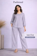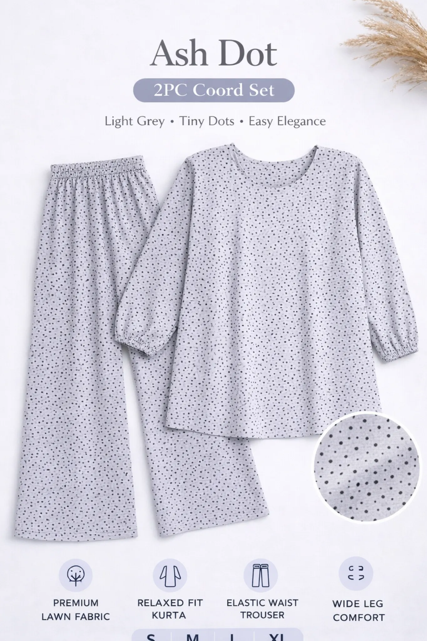 Light grey tiny dot print 2PC coord set by Pashmaal. Premium lawn fabric, relaxed fit kurta with elastic cuff sleeves and wide leg trouser. Easy elegance for everyday wear. Available in S, M, L, XL. COD available across Pakistan.