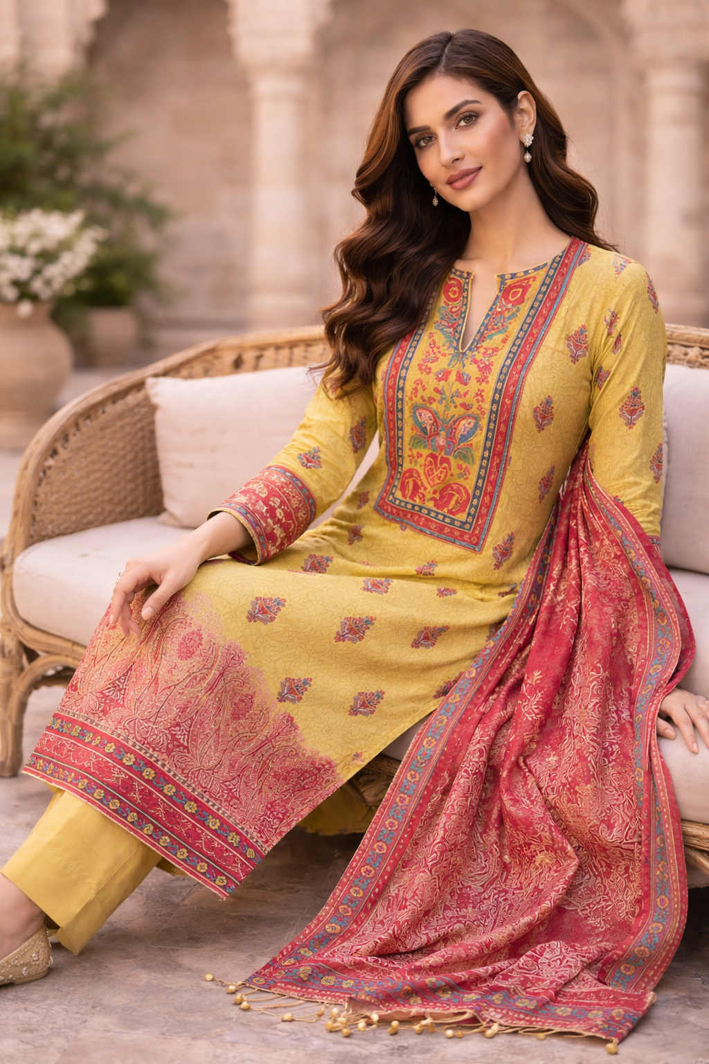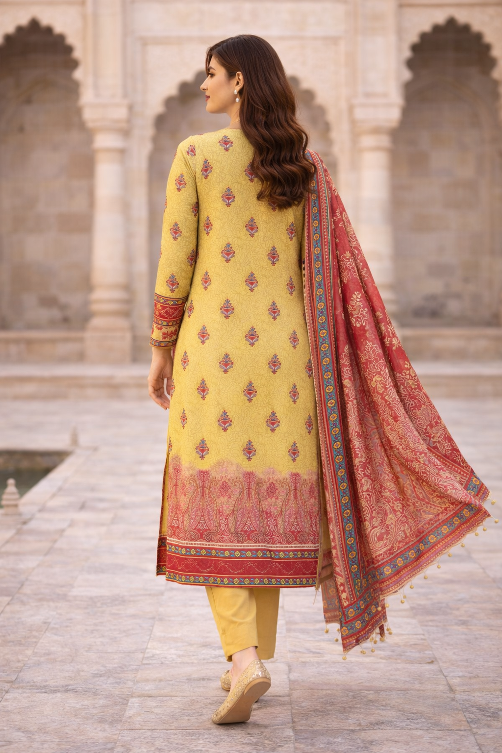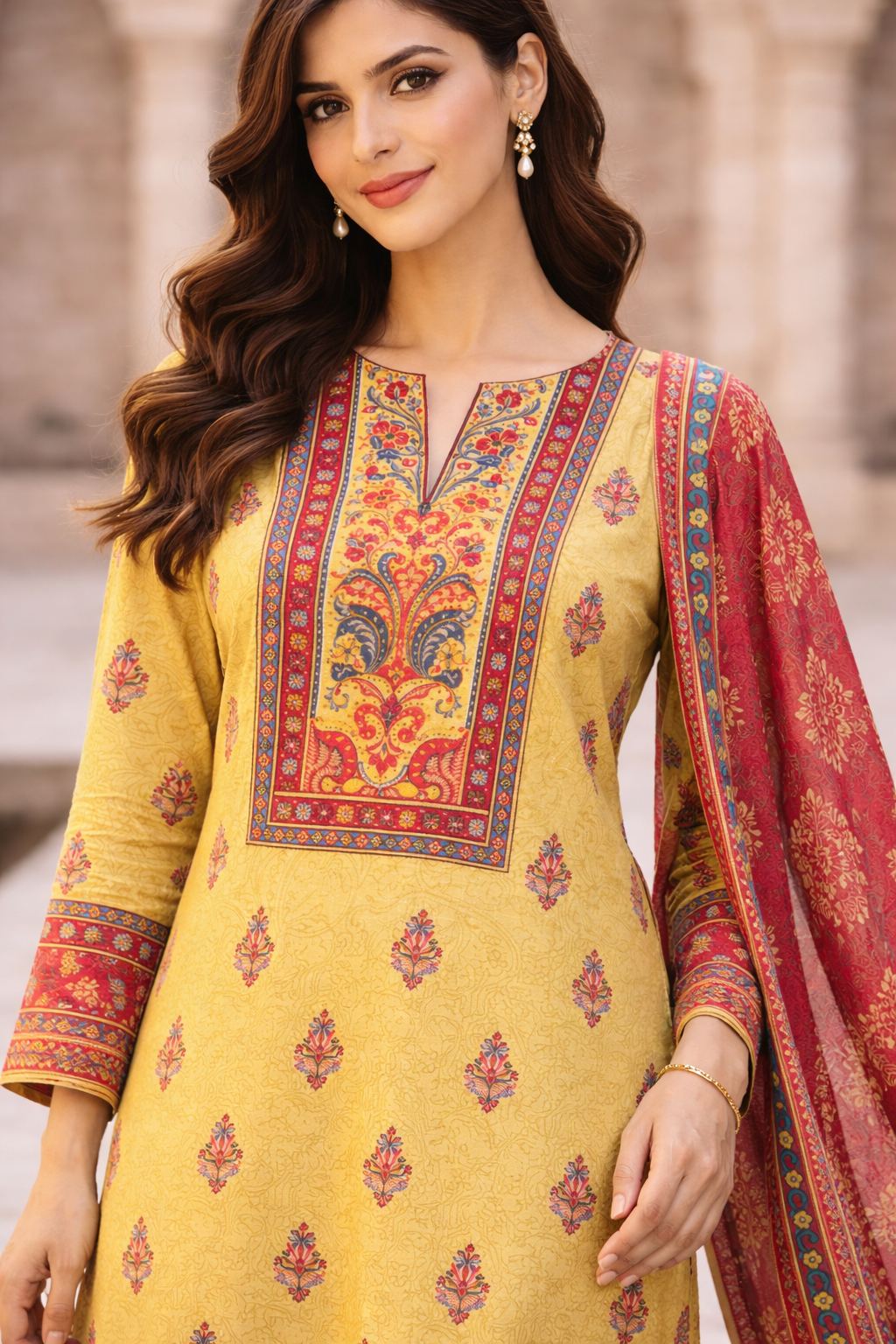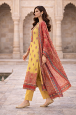 A vibrant 3-piece festive lawn suit featuring a mustard yellow printed shirt, paired with a richly detailed red printed dupatta and dyed trousers. Designed for elegant summer wear, perfect for Eid, festive gatherings, and daytime celebrations.