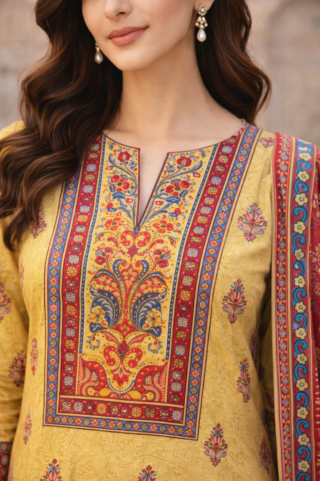 Complementing the shirt is a deep red printed lawn dupatta featuring heritage-inspired patterns and ornamental borders, creating a bold yet elegant contrast with the mustard base.