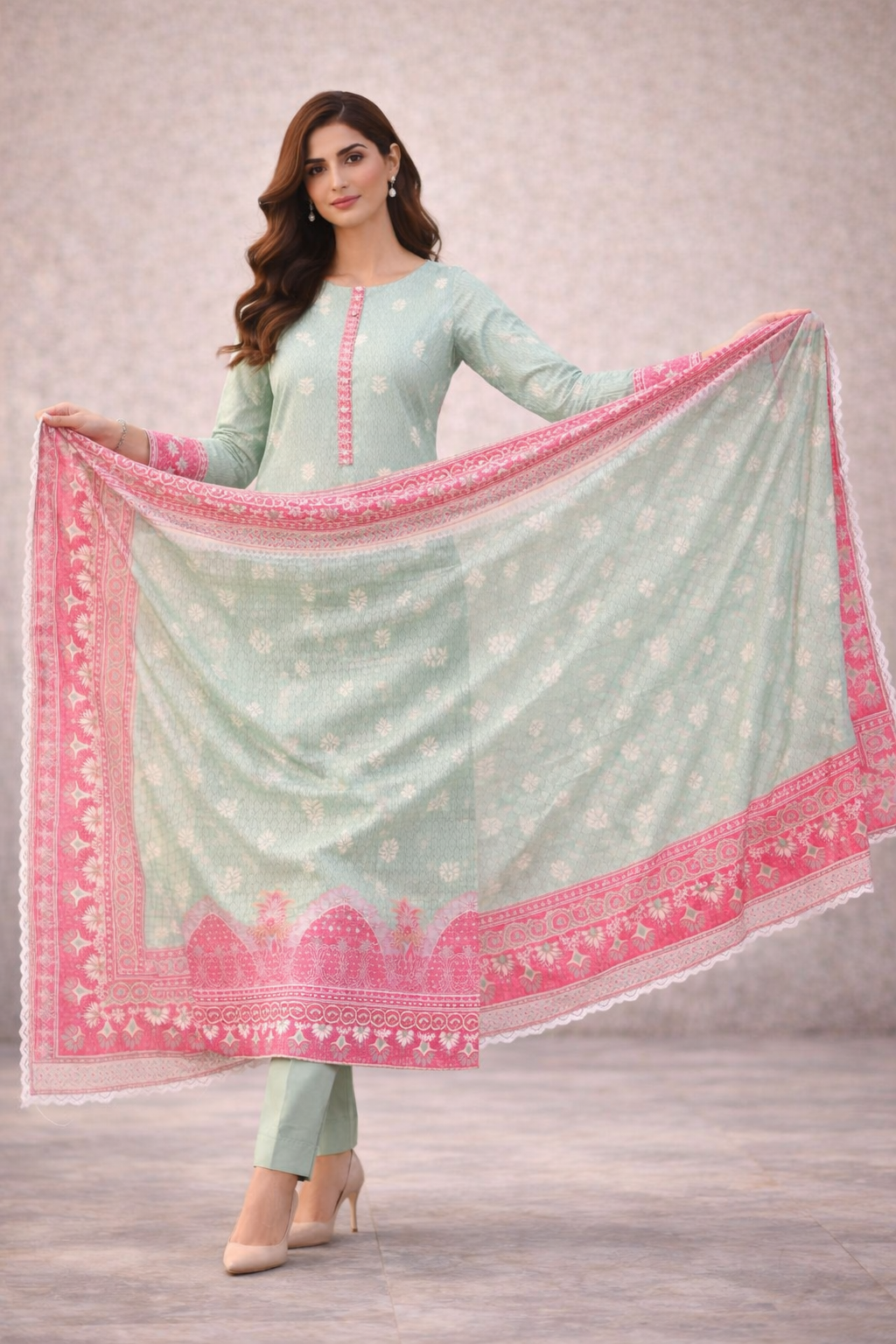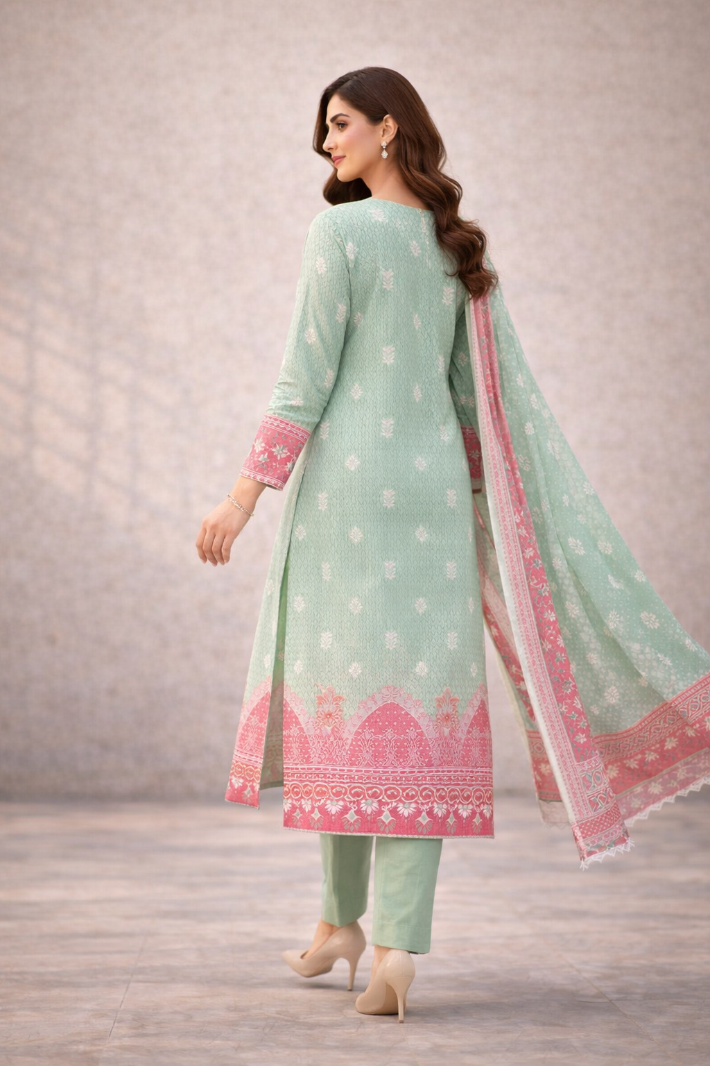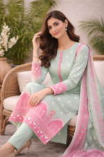 Crafted with premium breathable lawn fabric, this design ensures comfort while delivering a graceful festive presence.