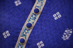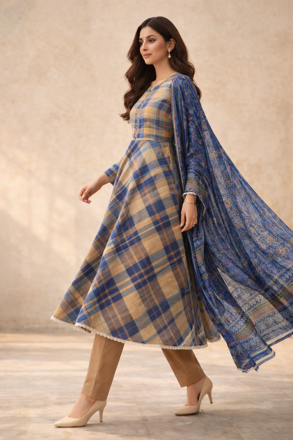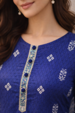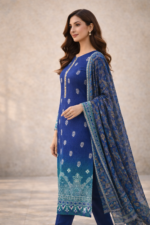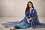 An elegant 3-piece festive lawn suit in deep royal blue, featuring delicate ethnic motifs, paired with a beautifully printed contrast dupatta and dyed trousers. Designed for a sophisticated look suitable for Eid gatherings, festive evenings, and summer celebrations.