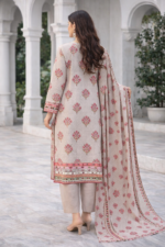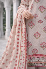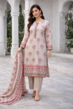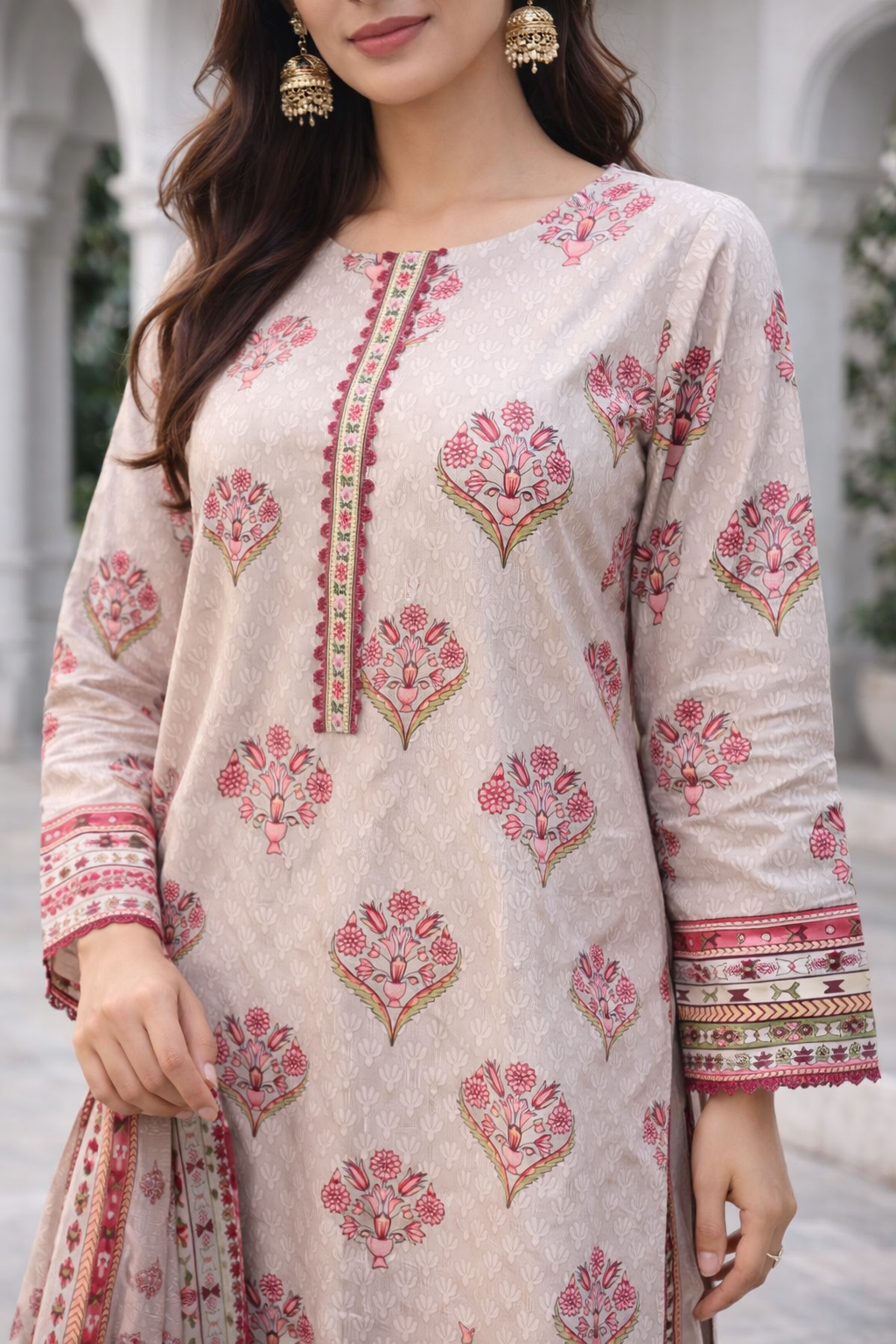 Blush Sand features floral digital prints on premium lawn with lace detailing, paired with a soft-toned dupatta and cambric trousers.