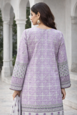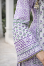 Lavender Whisper is a graceful daytime design crafted in super fine printed lawn. Featuring a blend of geometric and floral motifs, the shirt is finished with refined lace detailing on sleeves and daman. A coordinated printed dupatta and dyed cambric trousers complete the look.