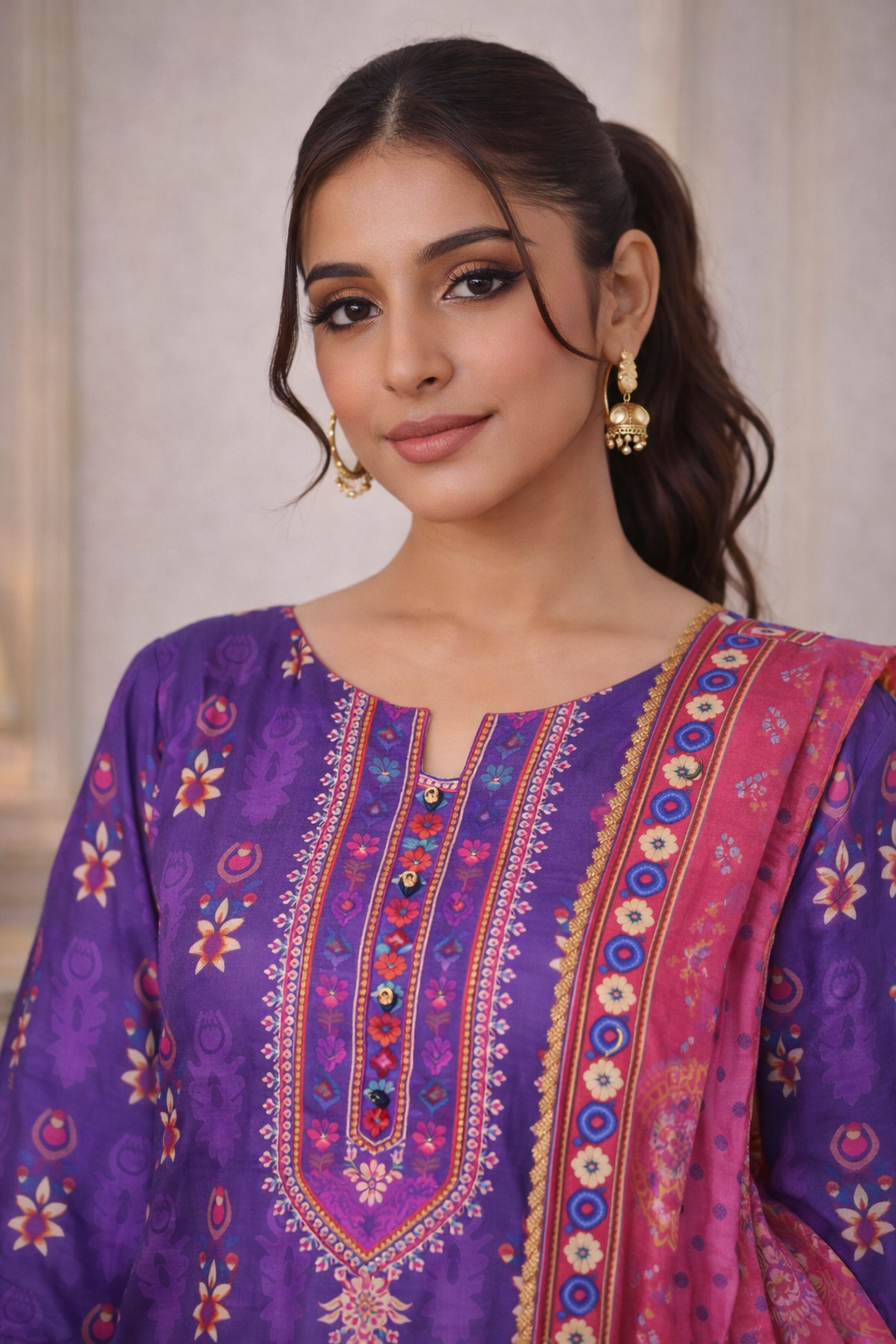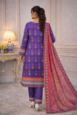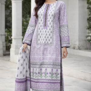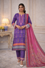 Royal Plum embodies sophisticated luxury. Designed in premium printed lawn, it features bold ethnic motifs, contrasting borders, lace finishing, and sleeve detailing. The beautifully printed dupatta and matching cambric trousers elevate this statement ensemble.